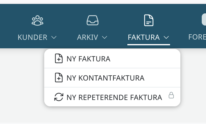 Etter at du har funnet ut av hvilken type dokument du trenger å opprette går du til menyvalget Faktura og velger enten Ny faktura eller Ny kontantfaktura. Deretter fyller du ut dokumentet på samme måte på begge alternativer.